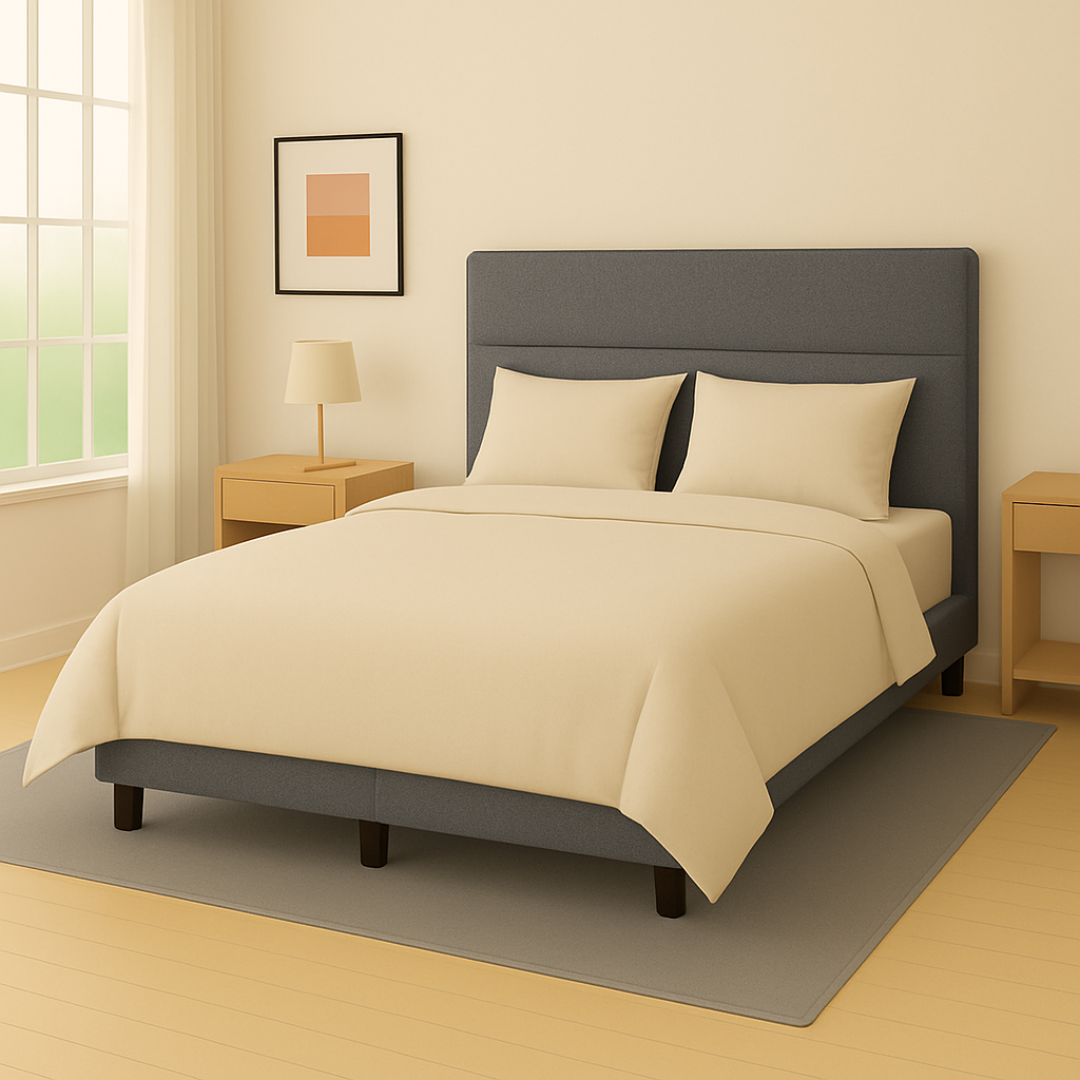 Dit moderne bed straalt rust en elegantie uit dankzij het strakke ontwerp en de luxe afwerking. Het royaal beklede hoofdbord met geometrische lijnen geeft een eigentijdse uitstraling en biedt extra comfort tijdens het lezen of ontspannen.